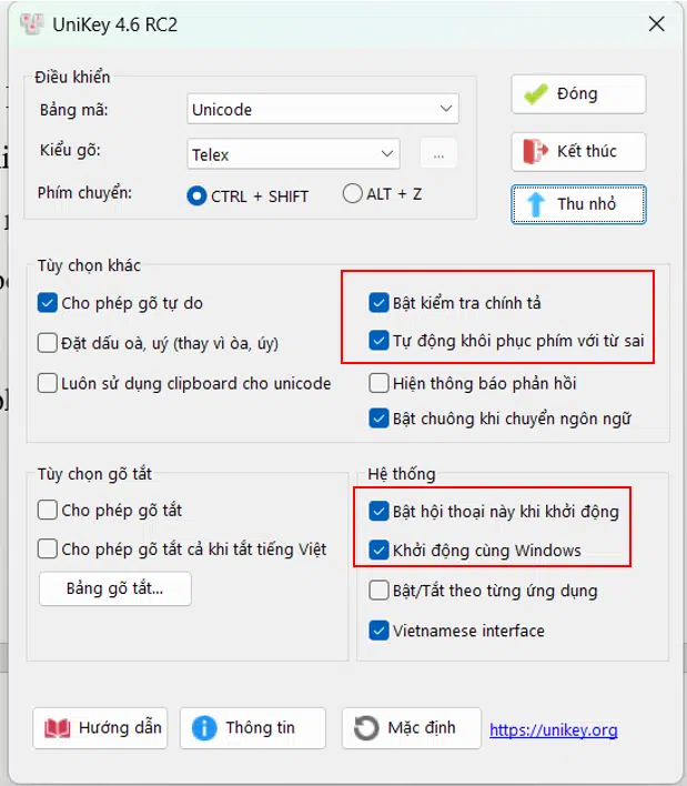 Tùy chọn Cho phép gõ tắt, tự động khôi phục…vv..